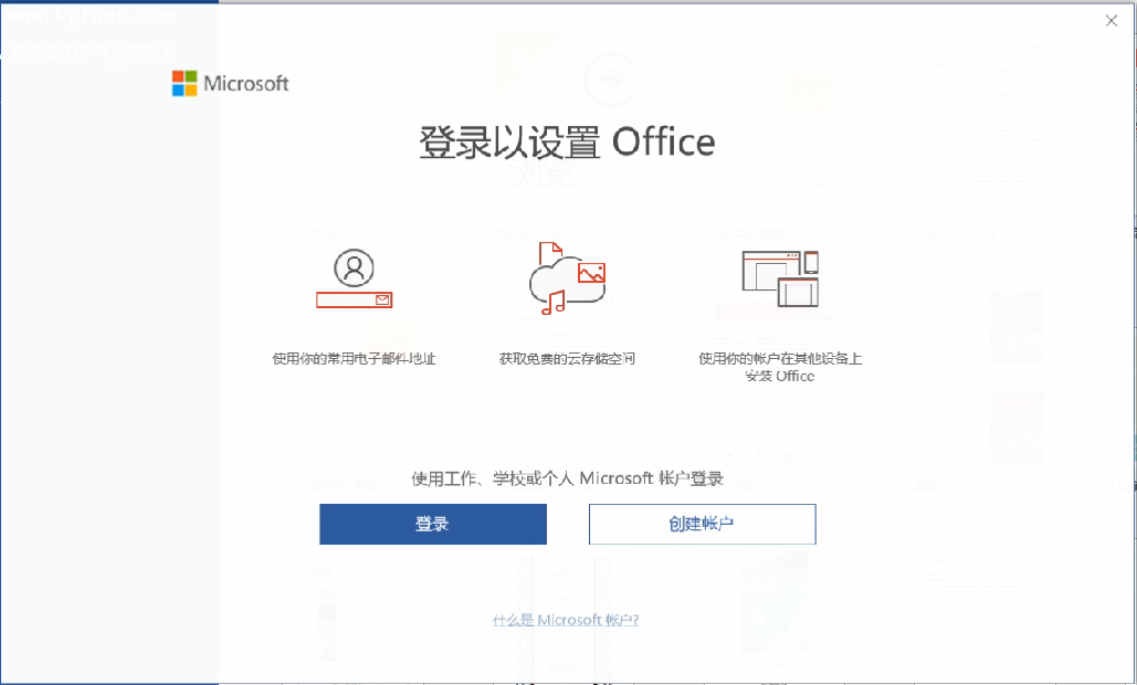 2. 打開(kāi)應(yīng)用后,會(huì)彈出“登錄以設(shè)置Office”界面,如果您有微軟帳戶(hù),點(diǎn)擊“登錄”;如果沒(méi)有微軟帳戶(hù),點(diǎn)擊“創(chuàng)建帳戶(hù)”并按照提示注冊(cè)一個(gè)。