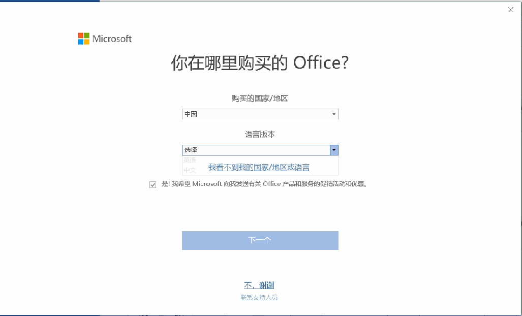 4. 根據(jù)提示設(shè)置地區(qū)和語(yǔ)言版本,選擇“中國(guó)”和“中文”,點(diǎn)擊“下一個(gè)”。