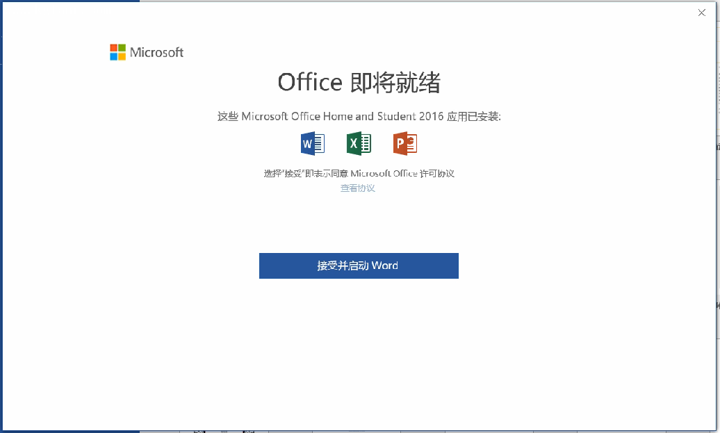 5. 稍等一段時(shí)間后會(huì)收到提示“Office即將就緒”,點(diǎn)擊“接受并啟動(dòng)XXX”(如下圖示例的是在 Word 中激活,點(diǎn)擊“接受并啟動(dòng)Word”)。