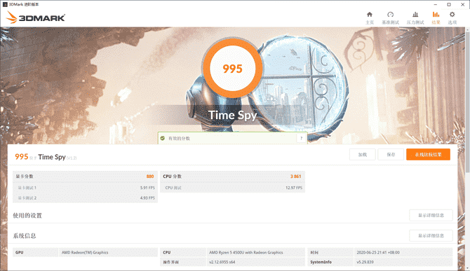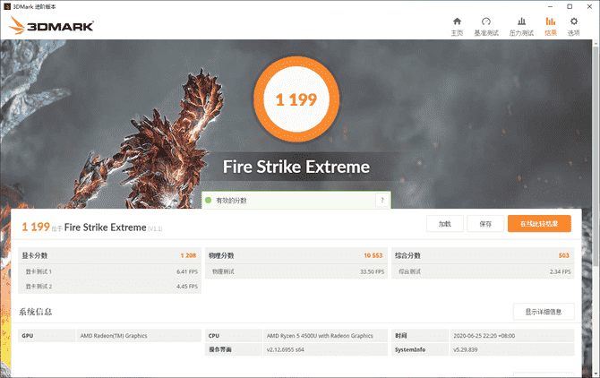 Fire Strike Extreme測(cè)試中,物理分?jǐn)?shù)10553,與Fire Strike 的測(cè)試基本相當(dāng),顯卡分?jǐn)?shù)1208,相比Fire Strike 的得分低也是正常,實(shí)際上我們不能對(duì)Radeon 6 Graphics (Renoir)顯卡過于期望,畢竟其定位就是日常辦公,而非高性能游戲。