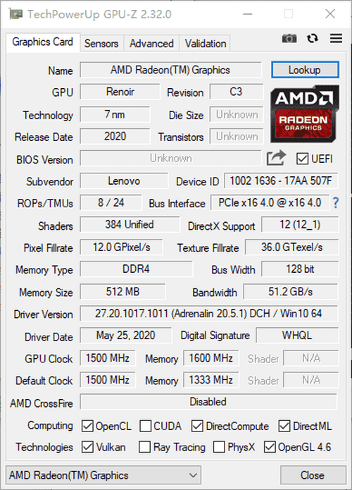 再來看看顯卡的性能,眾所周知,相比酷睿處理器的核顯,AMD顯卡的性能真的是太優(yōu)秀了,甚至可以對(duì)比MX系列的顯卡也絲毫不輸。銳龍5 4500U內(nèi)建了Radeon 6 Graphics (Renoir)顯卡,384個(gè)流處理器,8個(gè)ROPs以及24個(gè)紋理單元,在7nm制程工藝的加持下,基礎(chǔ)頻率提升到了1500MHz。