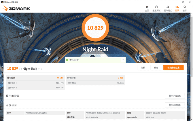 Night Raid主要測(cè)試DX12的表現(xiàn),包含了動(dòng)態(tài)反射、環(huán)境光遮擋、延遲渲染、曲面細(xì)分、復(fù)雜粒子與景深效果等測(cè)試,和Time Spy類似,但要求比Time Spy更低,可以看做一個(gè)低配版DX12測(cè)試項(xiàng)目。最終的綜合得分為10829。