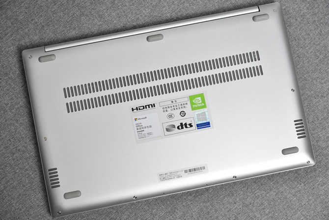 RedmiBook 14 Ⅱ在底部,前后共有5個長條形腳墊設計,既防滑也起到抬高機身利于散熱的作用,底部的較大面積的通風格柵,給機身內部提供更多循環。前部兩側的格柵是音箱部分,這款筆記本搭載了DTS專業音效的音箱,不僅聲音足夠大,音質表現也相當不錯。此外,這款筆記本還預裝了正版的Windows 10系統、Office家庭和學生版辦公軟件,以及在硬件上,NV、HDMI、DTS的認證標貼也被貼于底部,減少了這些貼紙也讓整機的C面掌托保持極簡風格。