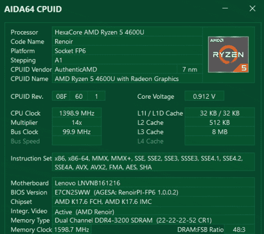 該機(jī)搭載的這顆Ryzen 5 4600U移動(dòng)處理器采用7nm制程,基于ZEN2架構(gòu)打造,6核/12線(xiàn)程設(shè)計(jì),基準(zhǔn)頻率2.1GHz,動(dòng)態(tài)擴(kuò)頻可達(dá)4.0GHz,TDP僅有15W。