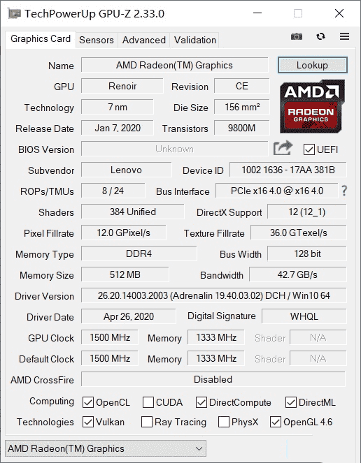 GPU方面,AMD Ryzen 5 4600U集成Radeon Graphics圖形處理器,配備384個渲染單元,圖形性能進一步得到加強。