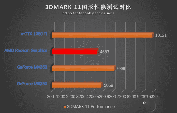 在3DMARK 11的測試中,P(Performance)模式下得分達到了4683分,圖形性能直追入門級獨立顯卡,與大多數(shù)筆記本采用的GeForce MX250基本相當。