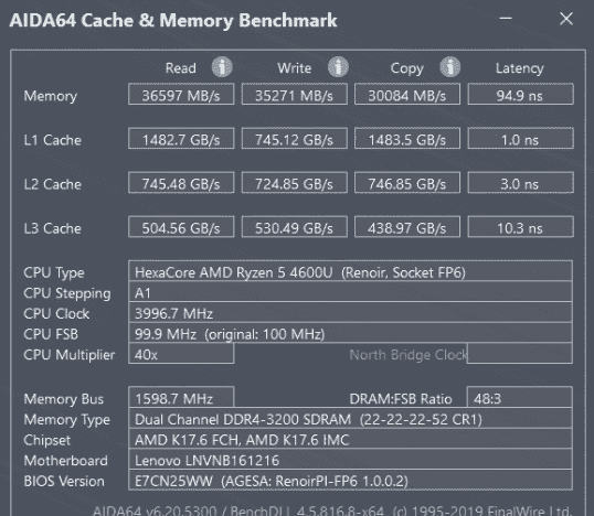 內(nèi)存讀寫方面,聯(lián)想小新15 2020銳龍版采用了16GB雙通道大內(nèi)存,頻率高達3200MHz,我們通過AIDA64 Cache&Memory Benchmark進行測試,在內(nèi)存讀取、寫入、復制速度等方面的表現(xiàn)分別為36597 MB/s、35271 MB/s、30084 MB/s,延遲94.9ns,整體表現(xiàn)良好。