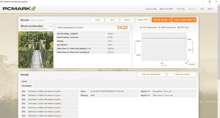 整機性能方面,在PCMARK 8的測試中,聯(lián)想小新15 2020銳龍版在Work accelerated負載下獲得5420分,達到了專業(yè)級筆記本的性能水平,整機性能沒的說,可以輕松滿足日常商務(wù)辦公、設(shè)計作圖、影音娛樂等需求。