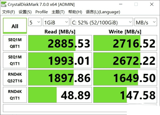 存儲方面,聯(lián)想小新15 2020銳龍版搭載了容量為512 GB的SSD,型號為來自西部數(shù)據(jù)的SN730,采用PCIe 3.0 x4通道,并且支持NVMe 1.3協(xié)議。在CrystalDiskMark的基準性能測試里,順序讀取速度為2885.53/S、寫入速度為2716.52MB/S,4K隨機讀取達到48.89MB/s,寫入速度147.58MB/s,整體表現(xiàn)在NVMe的SSD里也屬上乘。