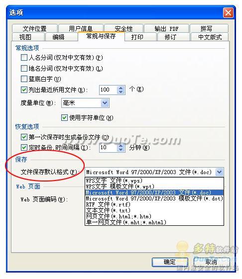 如果您希望默認(rèn)保存格式為“*.doc” ,點(diǎn)擊菜單“工具|選項(xiàng)”命令,彈出“選項(xiàng)”對話框。在“常規(guī)與保存”選項(xiàng)卡下的“文檔保存默認(rèn)格式”中選擇“Microsoft word97/2000/XP/2003 文件(*.doc)”即可將默認(rèn)格式改為doc,如下圖所示: