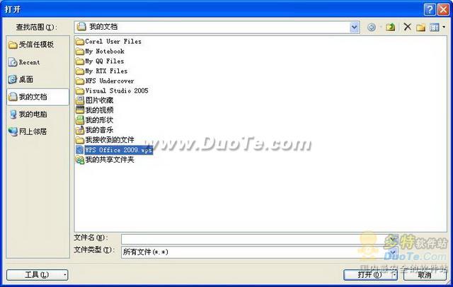 在MS Office中打開文件時(shí),在“選擇文件類型”中選擇“所有文件(*.*)”,即可打開wps格式的文件,如下圖所示: