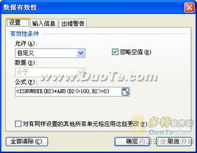 公式含義:ISNUMBER(B2)表示必須是數(shù)字,AND(B2<=100,B2>=0)表示數(shù)據(jù)必須在0-100之間;兩個條件中用*號連接表示必須同時滿足兩個條件。