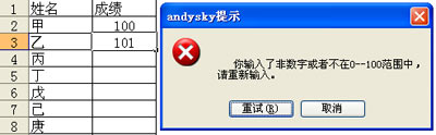 大家知道,學生成績是用數(shù)字表示的,且一般在0-100之間。那么只要掌握這個規(guī)律并對之進行相應的限制,成績錄入時就可防范出錯。(例如輸入小數(shù)點變成了逗號或者數(shù)據(jù)超過100分等等)。
