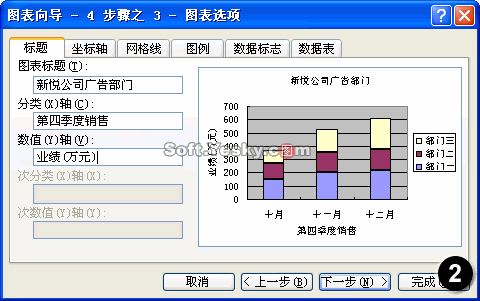 4. 單擊兩次“下一步”按鈕,進入“圖表選項”步驟,選擇“標(biāo)題”選項卡,在“圖表標(biāo)題”框中輸入“新悅公司廣告部門”;在“分類(X)軸”框中輸入“第四季度銷售”;在“數(shù)值(Y)軸”框中輸入“業(yè)績(萬元)”(圖 2)。