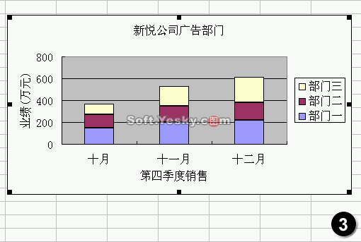 我們可以看到,這個圖表的外觀和前兩節(jié)課中使用“簇狀柱形圖”子類型的外觀有所不同,X分類軸中,每個月的柱形由三條變成一條,表示每個月的實際總銷售量,柱形中不同的色塊代表每個部門的實際銷售量。