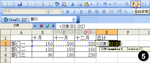 1. 在“柱形圖和餅圖”工作表中,選中E1單元格輸入“總計”,選中E2單元格,單擊常用工具欄上的“自動求和”按鈕,公式欄中自動顯示公式“=SUM(B2:D2)”(圖 5),表示對B2、C2、D2單元格進行求和。
