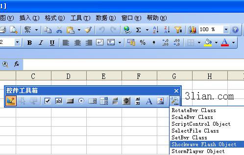 再單擊“控件工具箱”中的“其他控件”按鈕,在彈出的下拉列表中拖動滾動條找到Shockwave Flash Object選項(如圖2)后,單擊該選項。