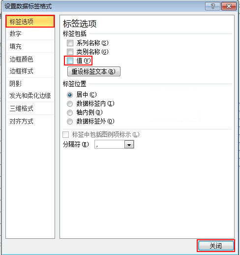 2、彈出“設置數據標簽格式”對話框,選擇“標簽選項”功能欄,在“標簽包括”選項組中撤選“值”復選框即可。