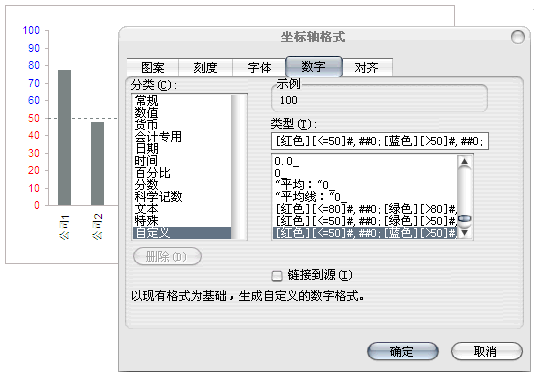 這個技巧利用數值的自定義格式,將Y軸的數值標簽,高于某一值(如預算完成率,50%)的顯示為綠色,低于某一值的顯示為紅色。在 坐標軸格式 》數字 》自定義 》 類型,輸入: