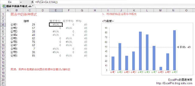 X軸的分類標簽本身無法設置條件格式,這一技巧不過是用輔助序列模擬罷了。下圖中,高于平均線(或其他閥值)的X軸標簽顯示為綠色,低于的顯示為紅色。