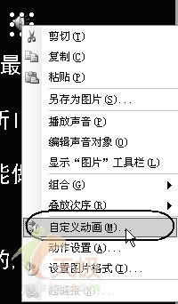 2.用鼠標右鍵單擊插入的聲音對象(喇叭圖標),在彈出的快捷菜單中選擇“自定義動畫”(圖4),在出現的“自定義動畫”任務窗格中,點擊剛剛插入的音樂選項右側的下接箭頭,在出現的菜單中單擊“效果選項”(圖5)。