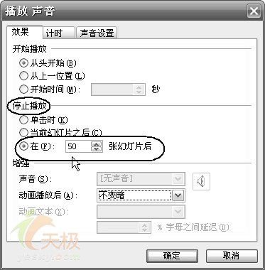 3.在彈出的“播放聲音”對話框中,在“效果”標簽中,在“停止播放”項下面選中“在(F):XX 張幻燈片之后”(中間XX為數字),在中間的數字增減框中輸入適當的數字(圖6)。