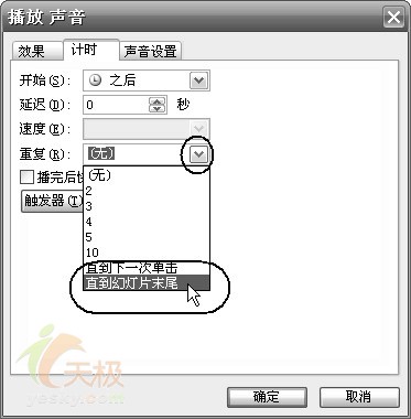 如果插入的聲音文件比較短,可以切換到“計時”標簽,在“重復”后面的下拉列表框中選中“直到幻燈片末尾”項(圖7),這樣就可發避免因為聲音文件太短,導致演示到后來沒有背景音樂的情況的發生。