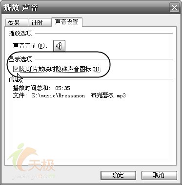 另外別忘了,切換到“聲音設置”標簽,勾選“幻燈片放映時隱藏聲音圖標”項(圖8),這樣在放映的時候小喇叭圖標就不會顯示了。