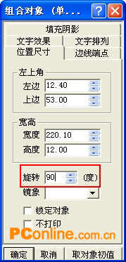 同時,在“位置尺寸”對話框的“旋轉”微調框中輸入90,將該對象旋轉。