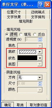 (6)再次點擊“圖形”工具欄中的“單行文字”按鈕,并在虛線框內輸入“密封線(考生答題時不能越過此線)”。設置文字大小并居中顯示。并通過右鍵菜單打開“單行文字”對話框,如圖08所示。設置其屬性,在“填充陰影”選項卡中將單行文字框填充為斜線。