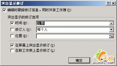 Excel不僅能處理當(dāng)前的修改沖突,而且還可以查詢沖突歷史,并按沖突歷史進行修改。點擊“審閱”菜單中的“修改”按鈕菜單中的“突出顯示修訂”項,將顯示如圖7所示的對話框。