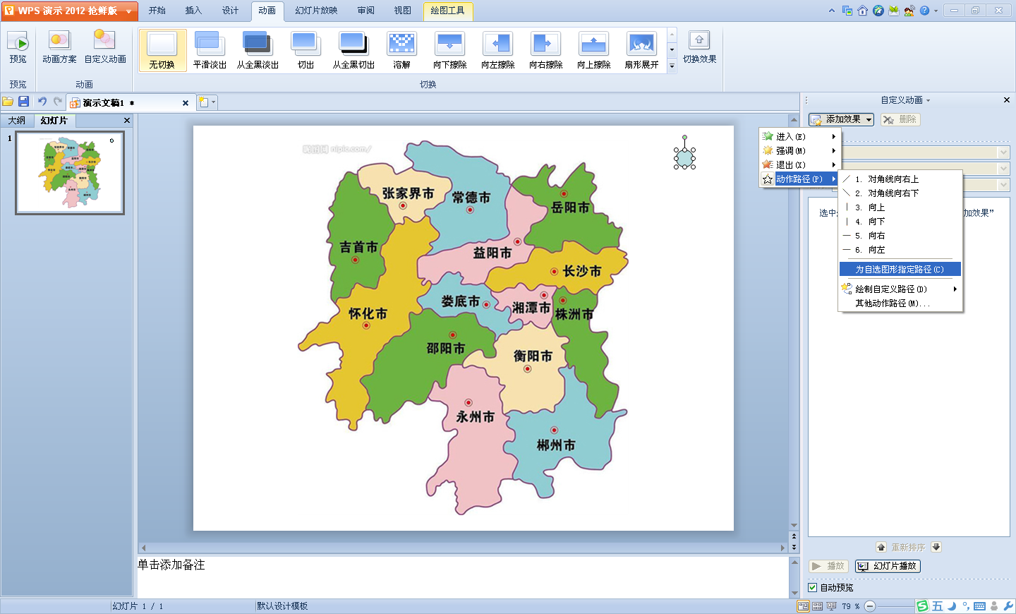 運用之妙存乎一心——妙用自定義動畫輕松繪制城市輪廓圖筆者的一位朋友在長沙任教,近日受教研部門委托上一節鄉土地理示范課,需要繪制出湖南各地市的輪廓圖,利用WPS強大的作圖功能固然可以實現(...