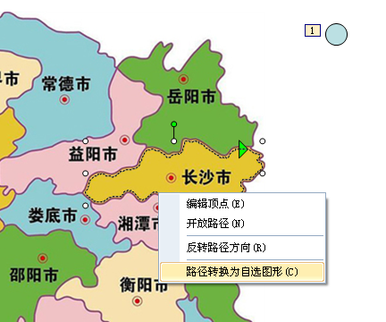 3、在小球的運動路徑上單擊鼠標右鍵,在彈出的快捷菜單里單擊“路徑轉換為自選圖形”命令(如圖6),即可得到一個與長沙市輪廓相同的不規則自選圖形(如圖7)。如果只想保留輪廓線,在自選圖形上雙擊鼠標,在彈出的“設置對象格式”對話框里將其填充顏色設為“無填充顏色”即可。