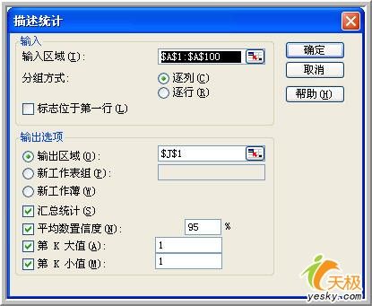 匯總統計:包括有平均值、標準誤差(相對于平均值)、中值、眾數、標準偏差、方差、峰值、偏斜度、極差、最小值、最大值、總和、總個數、最大值、最小值和置信度等相關項目。