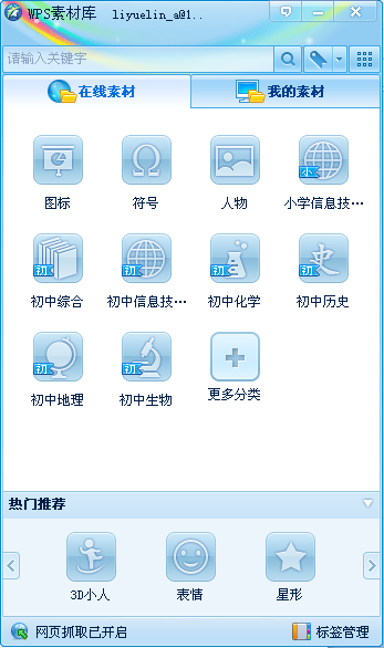在浩瀚的網絡海洋,有無窮無盡的網絡資源:一個個漂亮圖片,一段段精彩的文字,使用WPS素材庫能夠隨手把需要的素材收藏起來。只要開啟網頁抓取功能(圖2),素材庫那個漂亮的圖標就在你瀏覽網頁時,像一個小精類(圖3)一樣跟隨在你身邊了。