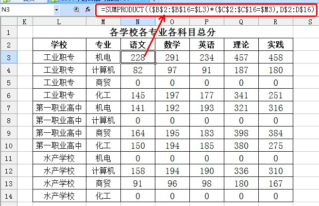 先建好空白表格,如圖2所示錄入學校名稱和專業名稱。在N2單元格輸入公式 “=SUMPRODUCT(($B$2:$B$16=$L3)*($C$2:$C$16=$M3),D$2:D$16)”,選中該單元格的填充句柄,向右和向下拖動復制公式至整個表格,那么各學校各專業各學科的總分就有了。不太難吧?
