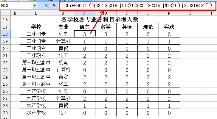 求和與求平均分只有一步之遙,那就是需要統計出各學校每個專業的人數。有了它,那么平均分就簡單多了。這同樣可以使用SUMPRODUCT函數來完成。