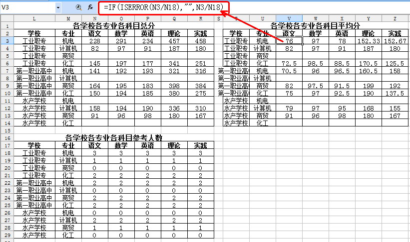 求平均分即拿總分除以人數。因此,如果人數為“0”,那么求平均分時就會出現問題。因此,在求平均分時,同樣需要用IF函數做一個判斷。借用前面的兩個表格,那么工業職專機電專業的語文平均分公式可寫為“=IF(ISERROR(N3/N18),"",N3/N18)”,其余的復制公式即可,如圖4所示。