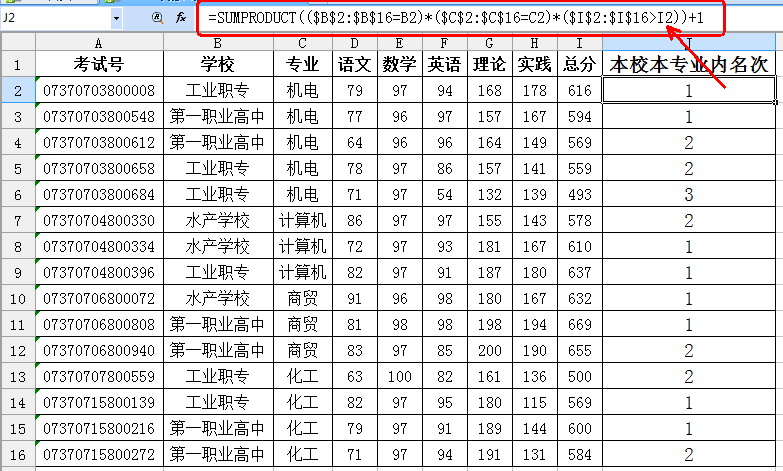 在不破壞原來數據表排序的情況下,為每位學生排定在本校本專業內的名次,看起來很難,但是有了SUMPRODUCT就不一樣了。試想一下,借助于SUMPRODUCT函數,我們可以輕松統計出符合多個條件的人數。那么工業職專機電專業總分為“616”的同學的名次,不就是學校為“工業職專”、專業為“機電”、總分“>616”的人數再加上1嘛!