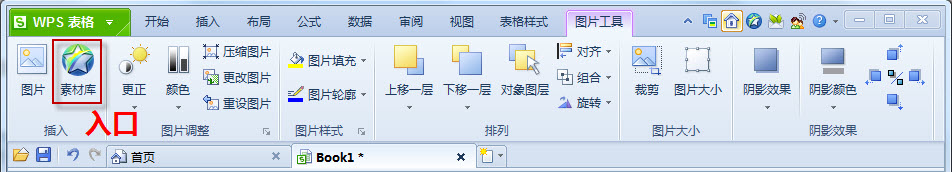 3.啟動WPS文字/表格/演示,2012界面下,單擊圖片工具選項卡下“素材庫”圖標