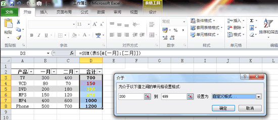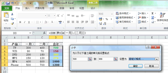 如果要對下表中“合計”列中的數(shù)據(jù)進行不同顏色的區(qū)分,如:值小于200的用紅色表示,值在200與499之間的用黃色表示,值在500與999之間的用綠色表示,值在1000以上的加上邊框。怎么做?選中上圖中“合計&...