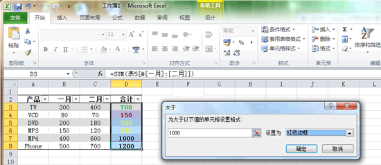 再次單擊“條件格式”,移動鼠標(biāo)到顯示的下拉菜單“突出顯示單元格規(guī)則”上,在展開的菜單中單擊“大于”命令,在彈出的對話框中輸入值“1000”,設(shè)置為“紅色邊框”。