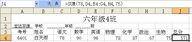 我們在 J4單元格中可以輸入 =sum(C4:I4) ,還可以輸入 =sum(c4,d4,e4,f4,g4,h4,i4) ,還可以這兩種方式混合著寫,如 =sum(c4,d4:f4,g4:i4),還可以直接輸入數字,如=sum(78,d4:f4,g4:i4),以上輸入法最終效果都是相同的,具體用哪種可以根據個人愛好決定。