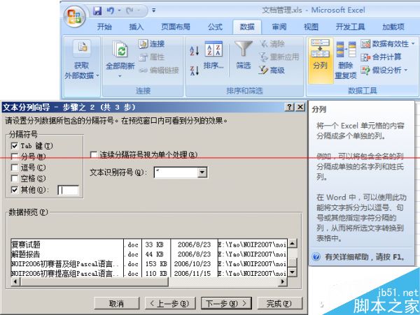 在PrintFolder軟件右側(cè)的搜索結(jié)果框中,右擊打開快捷菜單,依次執(zhí)行“全選”和“復(fù)制”命令,復(fù)制上述搜索結(jié)果;然后打開Excel2007,將其全部粘貼到一個(gè)新工作表當(dāng)中,然后選定該列數(shù)據(jù),執(zhí)行“數(shù)據(jù)-分列”命令,通過“文本分列向?qū)?rdquo;,選擇文本分隔符號為“|”,將各個(gè)文檔屬性值分列顯示(圖3)。