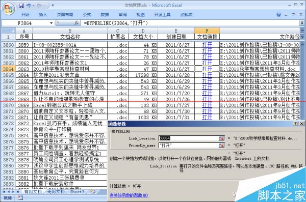 根據(jù)表格內(nèi)容,設(shè)置好對應(yīng)的Excel表頭。如果想讓文檔目錄檢索更為方便一些,可以選定整個(gè)數(shù)據(jù)區(qū)域,將文檔按指定屬性值進(jìn)行排序,這里以文件類型為主要關(guān)鍵字,以創(chuàng)建日期為次要關(guān)鍵字進(jìn)行排序。在F列中插入HYPERLINK函數(shù),該函數(shù)的作用是“創(chuàng)建一個(gè)快捷方式或鏈接,以便打開一個(gè)存儲在本地硬盤、局域網(wǎng)服務(wù)器或Internet上的文檔”,Link_location參數(shù)表示文件路徑,這里對應(yīng)G列中的內(nèi)容,F(xiàn)riendly_name參數(shù)表示超鏈接的名稱,這里設(shè)置為“打開”,將該函數(shù)復(fù)制應(yīng)用到整列單元格,即可完成文檔鏈接的創(chuàng)建操作(圖4)。