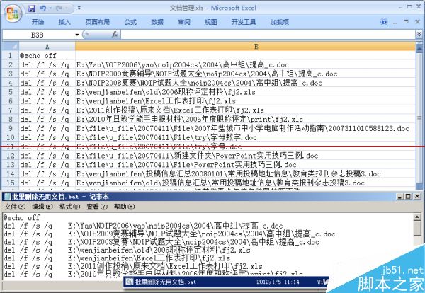 打開一個(gè)臨時(shí)工作表,首先,在A1單元格中輸入批處理命令的開啟符號@echo off,在A2單元格中輸入強(qiáng)制刪除命令del /f /s /q,并復(fù)制到A列的其他單元格中,其中/f參數(shù)表示強(qiáng)制刪除只讀文件;/s參數(shù)表示從所有子文件夾中刪除指定文件;/q參數(shù)表示安靜模式,即刪除時(shí)不需要進(jìn)行確認(rèn)操作。接下來,將需要刪除的文件路徑信息復(fù)制粘貼到B2單元格開始的B列單元格中。最后,復(fù)制該工作表中的所有內(nèi)容,并將其粘貼到一個(gè)記事本文檔中,執(zhí)行“文件→另存為”命令,將文本內(nèi)容轉(zhuǎn)存為擴(kuò)展名為bat的Windows批處理文件(圖6)。雙擊該文件,就可以飛快地批量刪除所有的無用文件。如果想將分布于不同文件夾中的重要文檔復(fù)制到同一個(gè)文件夾中進(jìn)行備份,只需要將刪除命令del修改為復(fù)制命令copy,參數(shù)調(diào)整為/y,在C列中設(shè)置備份文件夾,參照上述批處理文件的生成方法,同樣可以實(shí)現(xiàn)文檔的快速批量備份操作。
