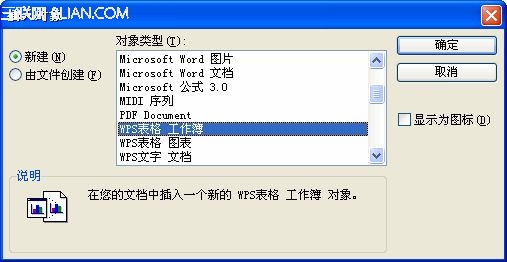 以上方法適合新建一個表格,如果需要利用現有的ET表格插入到WPS文字中,則在“插入對象”時,選擇“由文件創建”,并用“瀏覽”按鈕來選擇需要插入的ET文件,其他操作與前面相同,就不做贅述。