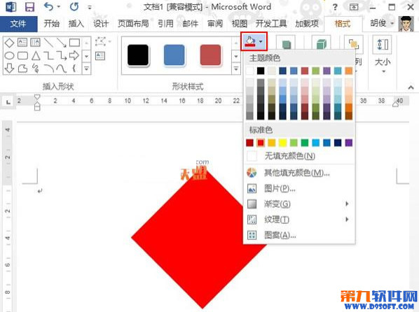 1.啟動Word2013,首先,單擊菜單欄--插入--形狀,選擇菱形,按住Shift鍵在空白頁面上畫出一個正菱形。 2.在格式選項卡下單擊填充按鈕,將其設置為紅色,無輪廓,做為背景紙張。 3.下面準備插入藝術字,點擊菜單欄--插入--...
