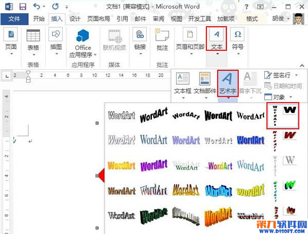 3.下面準備插入藝術字,點擊菜單欄--插入--文字--藝術字,選擇紅色方框標記的樣式,如圖所示。