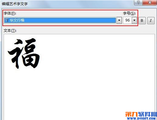 4.彈出編輯藝術字文字對話框,在文本中輸入“福”字,字體為華文行楷,單擊確定。